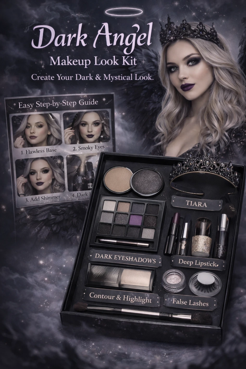 A Dark Angel makeup look blends elegance, mystery, and a touch of the supernatural. Unlike traditional angel looks, the Dark Angel uses deeper tones, dramatic eyes, and subtle or bold metallic accents to create an alluring and powerful aesthetic. This style is perfect for themed photoshoots, Halloween, cosplay, or fantasy makeup enthusiasts.